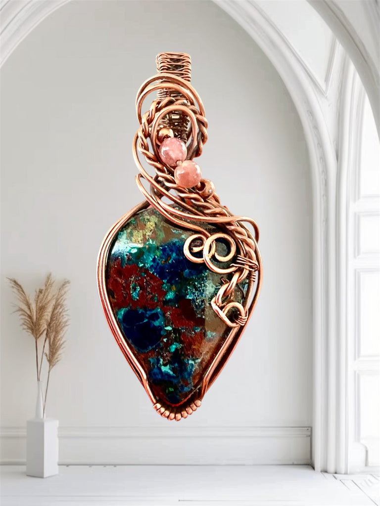 This vibrant one-of-a-kind pendant features a stunning Azurite and Chrysocolla gemstone wrapped in handwoven oxidised copper. Rich swirls of deep blue and earthy green and red shimmer through the natural stone, while two delicate Pink Tourmaline beads add a soft, feminine touch.