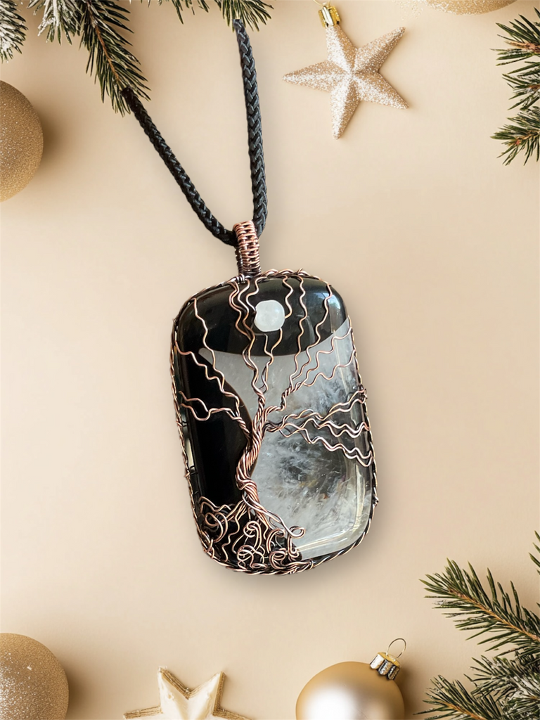 Black Druzy Agate Tree of Life with Moonstone Accent Pendant