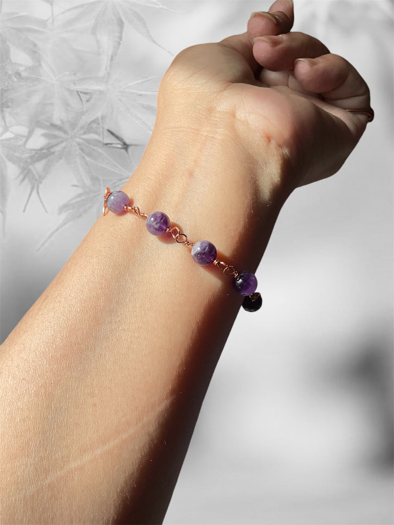 Unleash your daring spirit with our Chevron Amethyst, Dragon Vein Agate, Pink Cats Eye and Crazy Lace Agate handmade bracelets! Crafted with copper wire for each bead and one stretch bracelet these bracelets are a unique combination of style and strength. Take on any challenge and add a touch of adventure to your wardrobe.