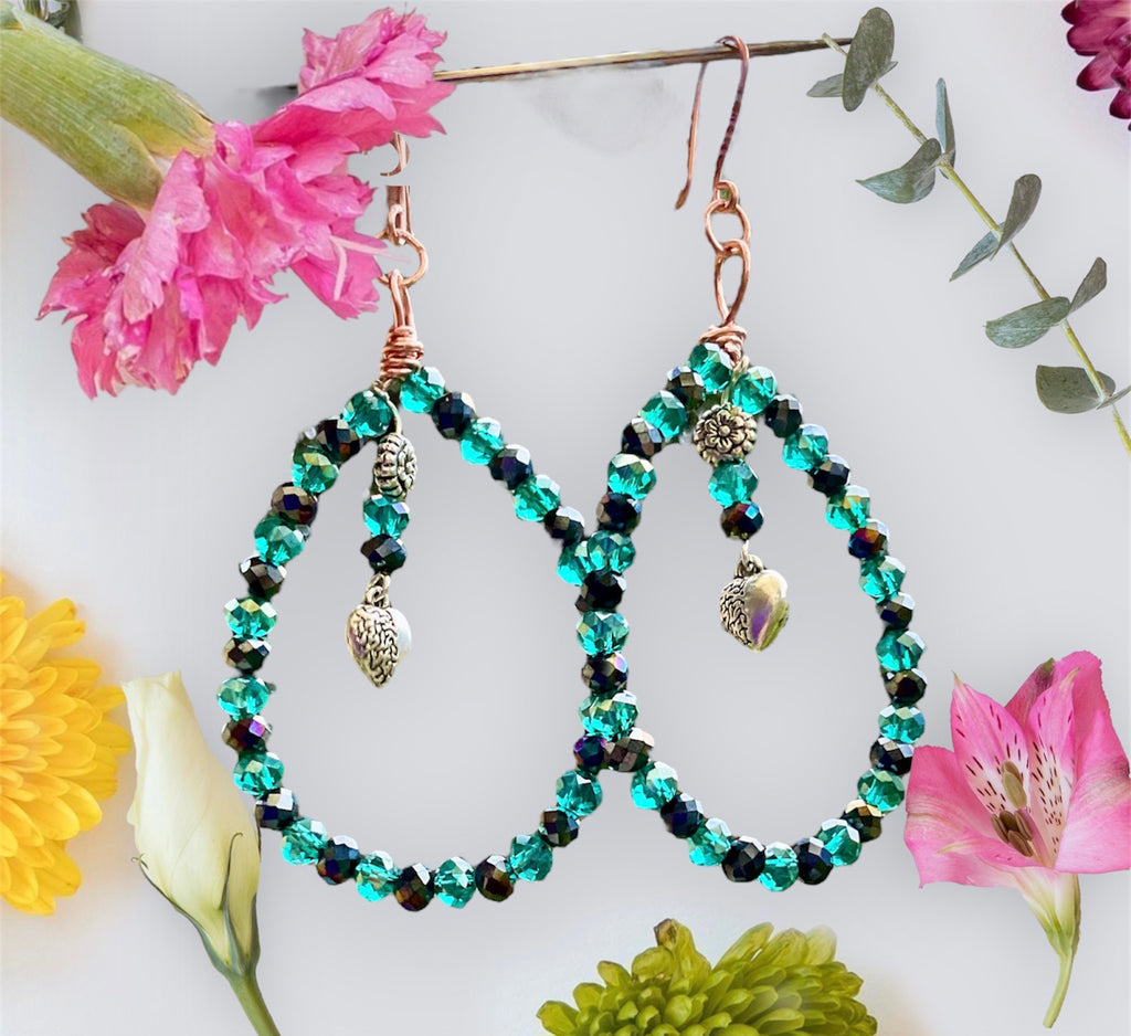These earrings are made with green and black Crystals and wrapped in copper wire, with Tibetan silver charms and spacers dangling from the top of the pear shaped earrings.   They have a drop of 95mm and weigh 22grams