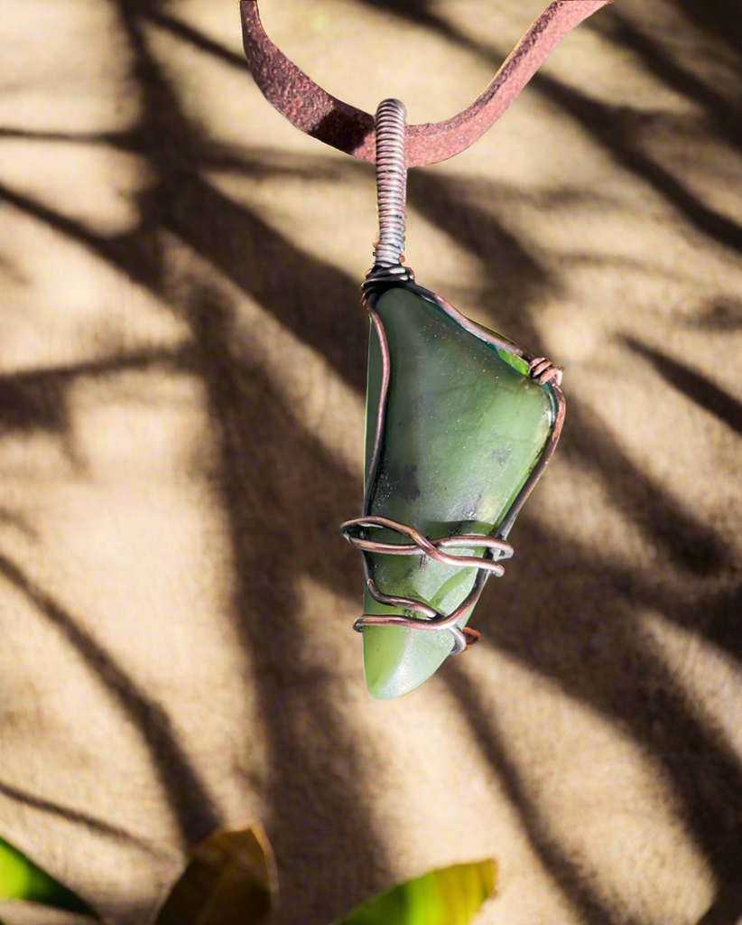 This beautiful wire wrapped Green Jade  is a pure Heart Chakra Green.   Its energies are so strong and steady,  when touching it , you feel the flow of well-being and balance.  Wire wrapped in antiqued copper,  included is a 3mm leather cord   The perfect gift for the man or woman in your life.   Green Jade is a Stone of abundance.  It represents the flow of divine energy and the never ending well of abundance that is the Universe.  Green Jade teaches you to allow Joy into your life.