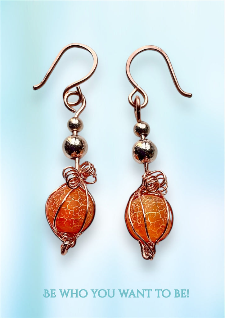 Expertly handcrafted with copper wire, these Halloween Pumpkin Earrings add a touch of festive flair to any outfit. One pair features Orange Sardonyx beads, which purifies the first 3 chakras and provides grounding and centeredness in the face of challenges, while the other showcases Orange crackle beads, both accented with rose gold for a polished finish. Perfect for celebrating the season in style.