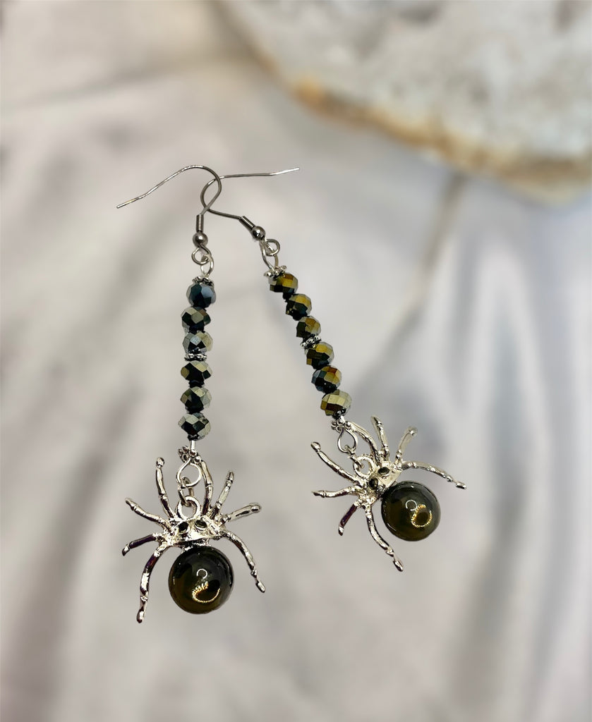 Adorn yourself with these stunning Halloween Spider Earrings. Made with Cat's Eye and Tibetan Silver, they are decorated with black crystals and feature hypoallergenic ear hooks.  Perfect for any spooky occasion.