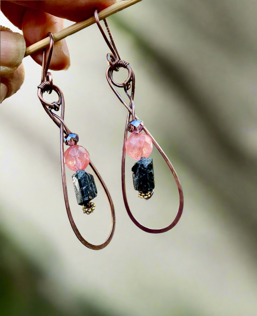 These stunning Handmade Tourmaline Earrings are crafted with black tourmaline and watermelon tourmaline stones, held together securely by pure copper wire. The unique design is sure to make a statement. Elevate your style with these beautiful earrings. These Handmade Tourmaline Earrings are made with black tourmaline to cleanse and protect. They help to keep your aura balanced even in challenging environments and to purge negative thoughts. Enjoy a high level of purification to uplift your consciousness and wellbeing.