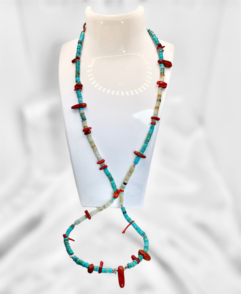This necklace is crafted with high-quality turquoise rondel beads, red coral, and agate. Tibetan silver spacers and a handmade copper clasp complete the elegant design, creating a 74cm piece that will elevate any outfit.