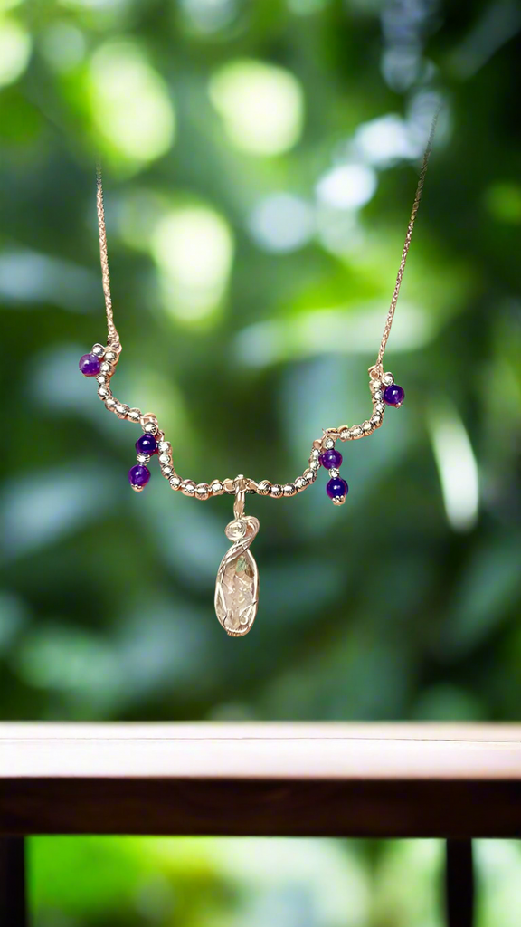 This Herkimar Diamond and Amethyst Necklace is a unique, handmade design featuring genuine Herkimar Diamonds and Amethyst crystals. Complemented with Tibetan Silver spacer beads and a silver chain, this beautiful piece provides a stunning addition to any wardrobe. Herkimer Diamonds are known for deflecting negative energy and granting clarity, while Amethyst is renowned for amplifying spiritual awareness and intuition - perfect for anyone looking to find spiritual balance and growth. This prismatic crystalline is also a powerful amplifier, magnifying the calming and protective properties of other stones. It helps to counterbalance mood swings, alleviating stress and amplifying intuition.