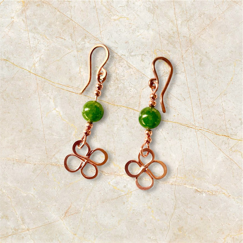 These delicate handmade earrings feature vibrant green jade beads paired with a sweet copper flower dangle — a symbol of natural beauty and harmony. Available in two styles: warm copper French hooks or hypoallergenic French hooks, perfect for sensitive ears.