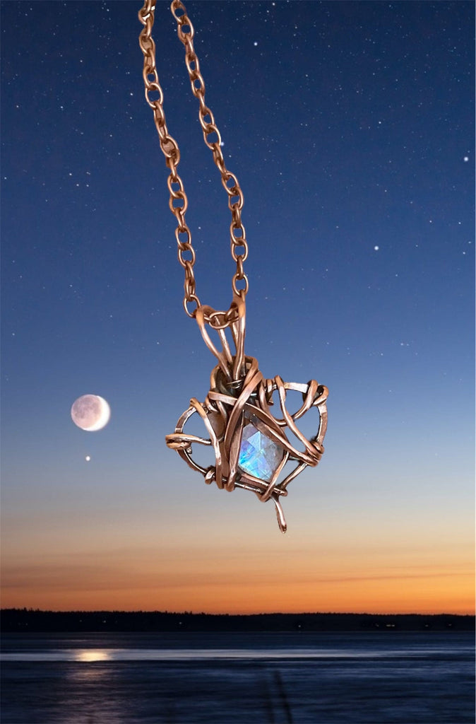 This exquisite Moonstone Wire Wrapped Pendant is crafted with copper wire that has been oxidised and polished for a beautiful finish. The stone itself is beautifully faceted with lots of blue flashes, offering a powerful connection to divine energy. Moonstone is known to balance and align one's energies so they can receive the universe's blessings. Perfect for those seeking inner peace, love and harmony.