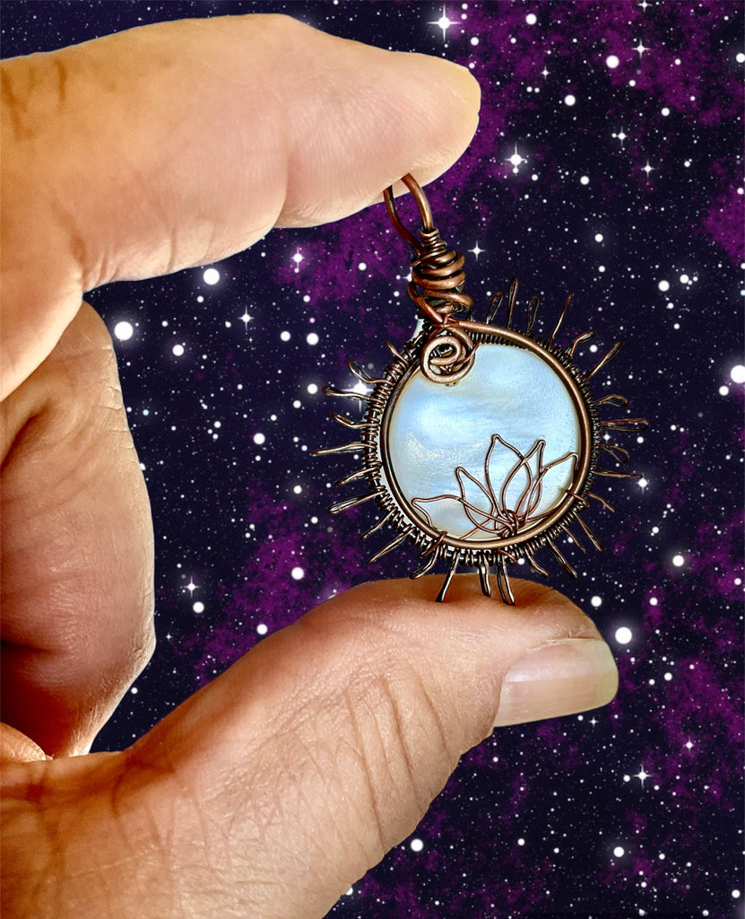 Enhance your style with our wire-wrapped Mother of Pearl Sun/Moon pendants. Crafted from delicate mollusk shells, this affordable semi-precious material is known for its mystical properties and believed to attract prosperity and enhance intuition. Each pendant is a unique work of art, showcasing the smooth and comforting mother of pearl layer inside the shell.