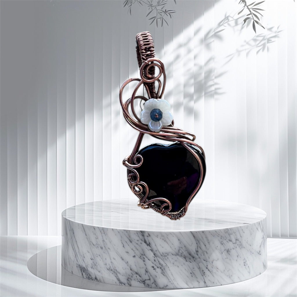These enchanting Black Obsidian Heart Pendants are handcrafted with care and artistry, featuring delicate Sapphire and Black Spinel flower accents for a touch of timeless elegance.