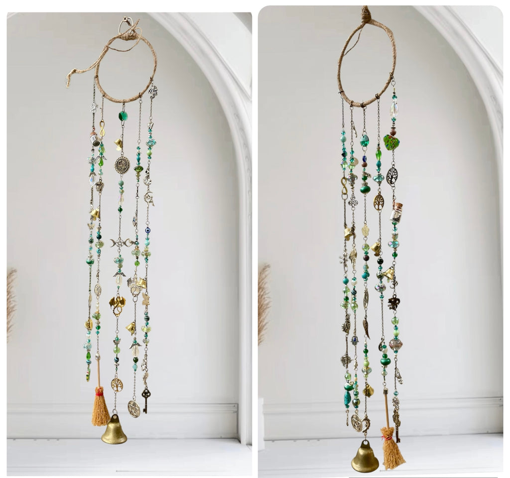 This enchanting pair of witch chimes was lovingly crafted as a special commission for a dear friend.  Infused with a teal aura and stretching up to 60 cm in length, they carry the essence of balance and flow.  Two days of spellbound creation brought them to life, weaving intention, beauty, and a touch of magic into every detail.  If you’d like one made especially For You in your favourite crystals or colours send me a message.