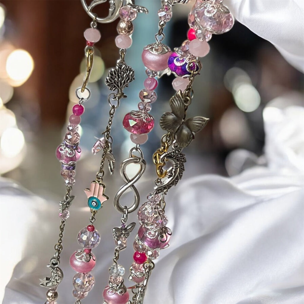 Each piece is lovingly made with a unique blend of crystals, gemstones, large hole European beads, and Tibetan silver charms, all carefully chosen to bring beauty, energy, and protection. The soft tinkling of the bells is said to ward off negativity, while the sparkling beads and charms radiate positive vibes and enchantment.