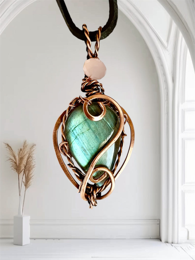 Carry the perfect balance of strength and love with this handcrafted pendant. The vibrant flash of Labradorite shines with hues of green and blue, wrapped securely in warm copper wire. Known as the Stone of Transformation, Labradorite enhances intuition, protection, and spiritual growth.